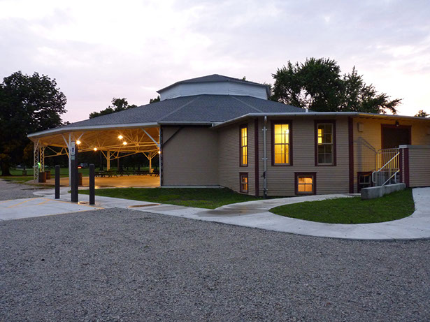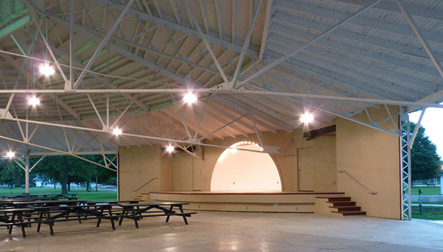 For over a generation the Stage, Band Shell, and Back Stage of Pana’s Chautauqua Auditorium/Pavilion were idled by deterioration. This once vital forum for community engagement remained dormant until this project. The Illinois Historic Preservation Agency made the determination it would be acceptable to remove the remains of the deteriorated wood structure and rebuild it. The Stage, Band Shell, and Back Stage were not salvageable except for two windows used in the new restrooms and were rebuilt to meet the Secretary of Interior Standards.