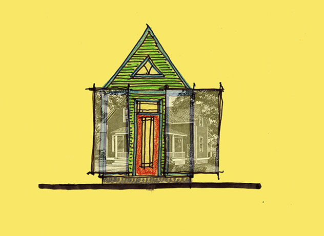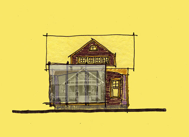 In addition, the designs conceive of historic photographs either of actual context or related drawings from plan book houses from the early twentieth century superimposed on the street facing facades. This unique artwork provides another way for these houses to have their own special identity.