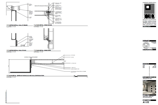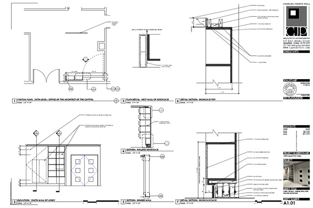 CJP Architects was engaged by The Office of the Architect of the Capitol (OAC) in Springfield, Illinois to provide alternatives to conceal existing electrical panels within their office lobby.  Ultimately the concept featuring a hinged wall and rolling bookshelf was selected.