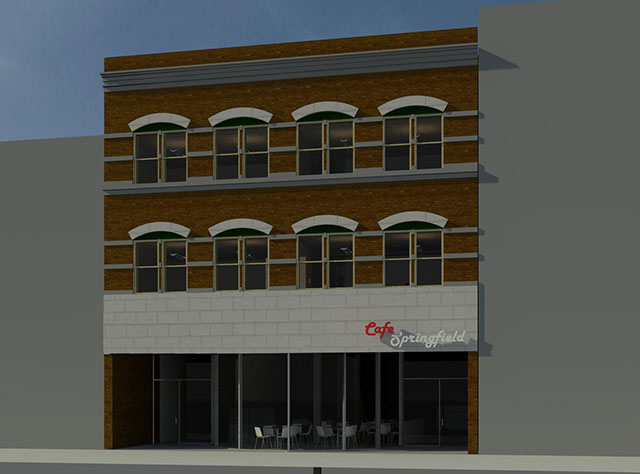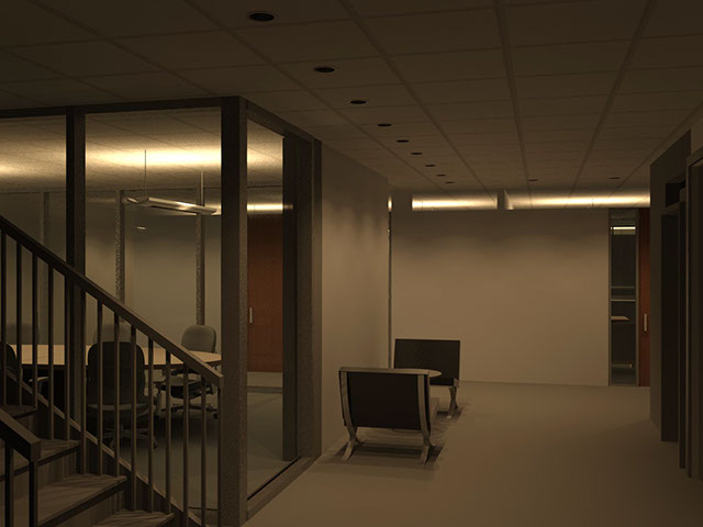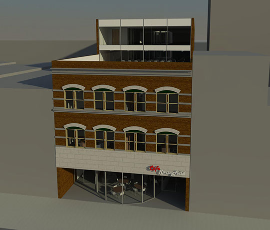 The design includes punching two light wells into the long narrow structure for natural light, the addition of a green roof/terrace, and the construction of a new volume of space at the fourth and fifth levels. The project is meant to take advantage of typical mixed use opportunities found in an urban environment by having retail and other activity at grade with professional office space on upper levels.