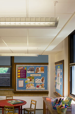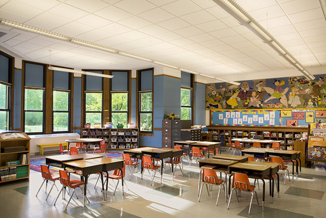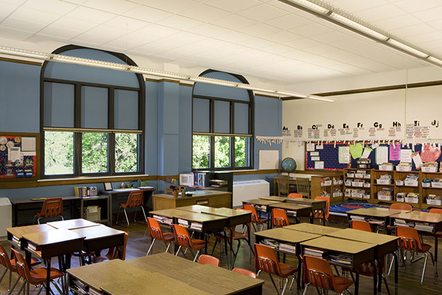 CJP Architects became the first architecture firm to use the next generation (T5) of fluorescent lighting in the district. After much discussion, the district’s Director of Operations & Maintenance agreed to let this school be a pilot project for the district. CJP Architects explained that in a building with such significant daylighting a light fixture with only one lamp in cross section would be required. Therefore, half as many T5 lamps would be needed to perform what two T8 or T12 lamps had been doing and would still be able to provide the type of light required by any student regardless of exterior light levels. Also, previous to the renovations the district was maintaining four different types of fluorescent lamps for the building; CJP Architects specified only fluorescent light fixtures (including those in mechanical spaces) using T5 lamps in order to only have one lamp type in the building. CJP Architects worked closely with their MEP consultant who had not completed a project involving this type of lighting; it was clear at the conclusion of the project they had been convinced to specify and recommend this type of lighting in future school projects.