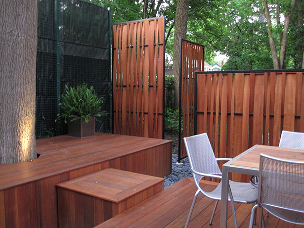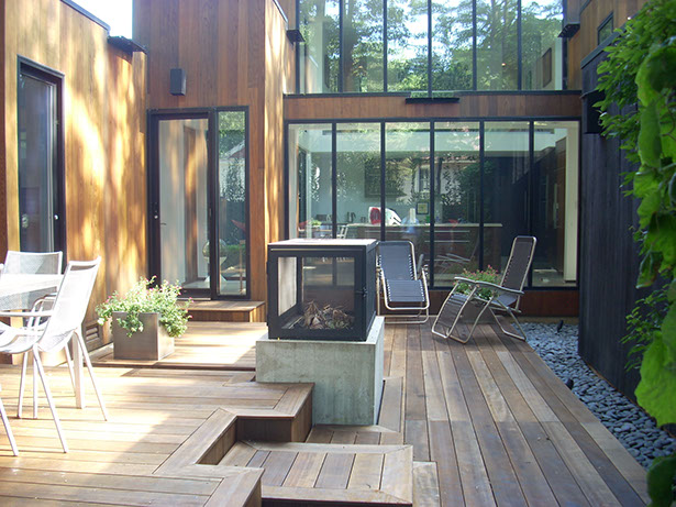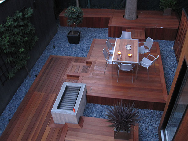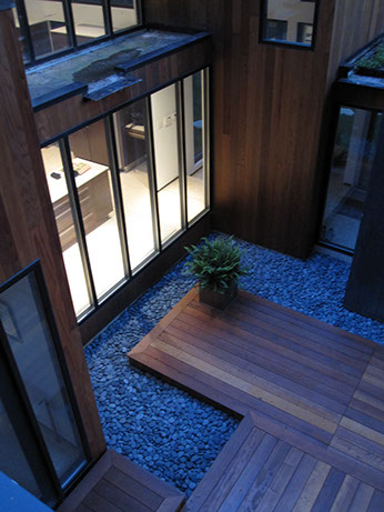 The addition, which was formed as a series of spaces, stands in contrast to the existing tightly restrained house. The design of the deck took its cues from the addition and is comprised of a series of levels in varying rectangular and square shapes. At the center of the deck is an exterior fire pit. In addition, a tall green wall shielded the exterior space from an alley as well as 3 fences that use the same exterior redwood cladding. The 3 redwood fences are also of varying sizes with varying widths of wood weaved through their metal structures.