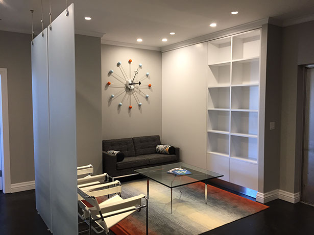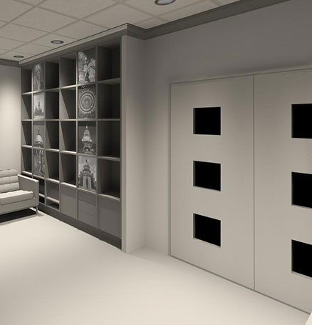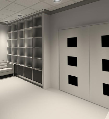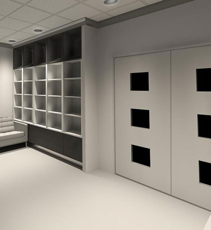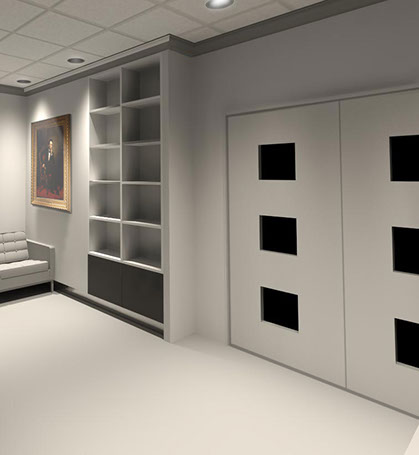 CJP Architects was engaged by The Office of the Architect of the Capitol (OAC) in Springfield, Illinois to provide alternatives to conceal existing electrical panels within their office lobby. Ultimately the concept featuring a hinged wall and rolling bookshelf was selected.