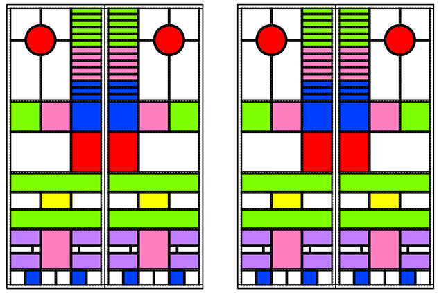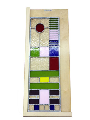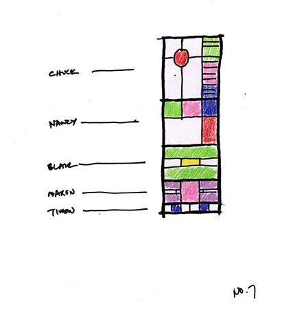 A family of five is represented in the hierarchy of the design from youngest at the bottom through oldest at the top. Each of three children along with their two parents is represented with individual panels within the overall panel. One color from each of the children’s panels is represented within their parents’ panels. Their mother has those colors in equal sizes while their father has their colors in quantities relating to their age and hierarchy in the family. The father is surrounded by his wife in his panel and his primary color is red while the wife’s primary color is a clear patterned glass; her color is found within all of the panels.
