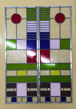 The design for bookcases on either side of a fireplace in a 1927 “bungalow” became the framework for the design of stained glass panels in doors enclosing the bookcases. The design, Concept No. 7, represents the family of the owner/architect.