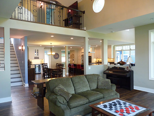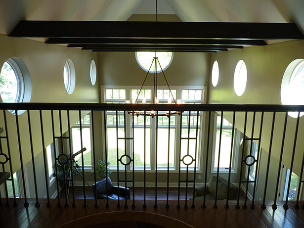 Conceptually the house was to take on more vibrant characteristics such as its color scheme, “fat” columns, large round clerestory windows, a stair tower connecting levels, and a dynamic kitchen area. These features enhance the setting and connect the owners and their house with the lake which was the primary reason to select the location.