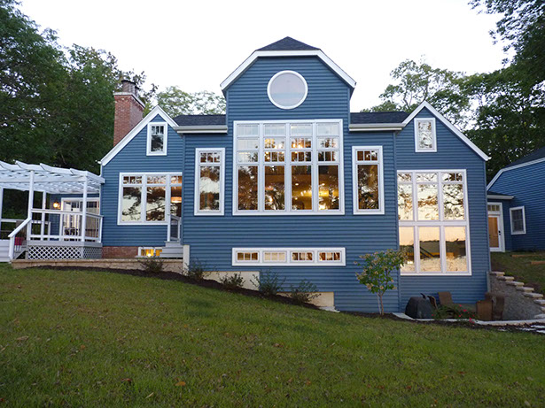 The program created a master suite on the first level and a new informal living space connected to a dining area and kitchen. The new living space took into consideration the views to and from the lake with large amounts of glass allowing for the views and natural light.